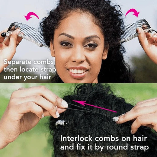 • Separate the combs, then put the strap under your hair